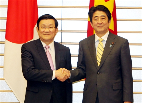 Lors de l'entretien entre le président Truong Tân Sang et le Premier ministre Shinzo Abe, le 18 mars, les deux parties ont décidé, sur la base des relations de coopération bilatérale qui se sont vigoureusement développées ces dernières années, de porter leurs relations de partenariat stratégique à la hauteur d'un partenariat stratégique approfondi, pour la paix et la prospérité en Asie. Les deux dirigeants ont estimé que cette évolution des relations manifeste la confiance politique et reflète l'approfondissement des relations entre les deux pays en tous domaines, conformément aux intérêts fondamentaux et durables de chacun, tout en répondant aux souhaits des deux peuples et en contribuant à la paix, à la stabilité, à la coopération et au développement dans la région comme dans le monde.