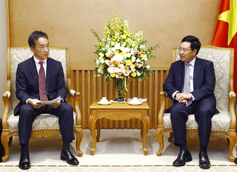 | Le vice-Premier ministre et ministre des Affaires étrangères, Pham Binh Minh (droite), et le vice-président de la JICA, Shinya Ejima. |