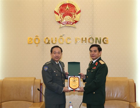 | Le général Phan Van Giang, chef d'État-major général de l'Armée populaire du Vietnam (droite), et le général Yamazaki Koji, chef d’état-major de la Force terrestre d'auto-défense du Japon. |
