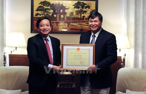 | L'ambassadeur du Vietnam au Japon, Doàn Xuân Hung (gauche), reçoit le satisfecit du Comité populaire de Hai Phong. |