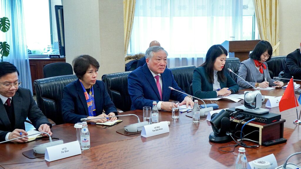| Lors de la séance de travail entre le vice-Premier ministre permanent du Vietnam, Nguyên Hoa Binh et le vice-Premier ministre et ministre de l'Économie nationale du Kazakhstan, Serik Zhumangarin. |
