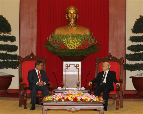 | Le secrétaire général du Parti communiste du Vietnam, Nguyên Phu Trong (droite), et le président de la Commission d'organisation du Comité central du Parti populaire révolutionnaire du Laos, Chansy Phosikham, le 21 janvier à Hanoi |