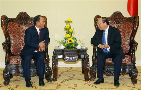 | Le vice-Premier ministre Nguyên Xuân Phuc (droite) reçoit le ministre lao de l’Intérieur, Saysi Santivong, le 6 avril à Hanoi. |