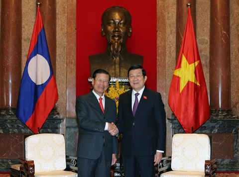 | Le président vietnamien Truong Tân Sang (droite) et le vice-Premier ministre lao Somsavat Lengsavad, le 28 mars à Hanoi. |