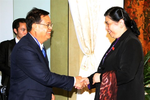 | La vice-présidente de l'Assemblée nationale Tong Thi Phong et son homologue lao Somphanh Phengkhammy, le 11 mai à Hô Chi Minh-Ville. |