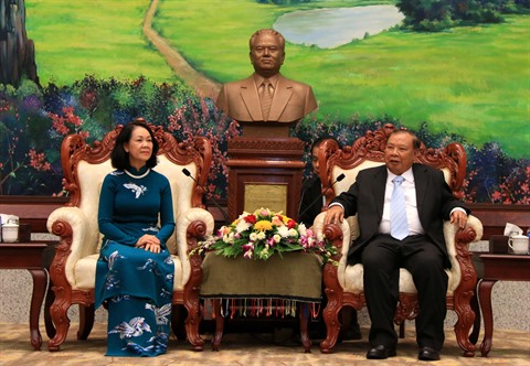 | Le secrétaire général du PPRL et président du Laos, Bounnhang Vorachith, reçoit la chef de la Commission centrale de sensibilisation des masses du PCV, Truong Thi Mai, le 27 octobre à Vientiane. |
