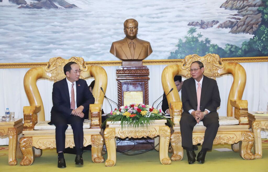 | Rencontre entre le vice-ministre vietnamien de la Police, Trân Quôc To (droite) et Vilay Lakhamhong, vice-Premier ministre lao et ministre de la Police. |