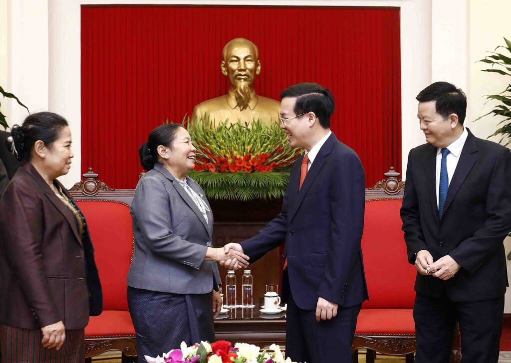| Vo Van Thuong (2e droite), permanent du Secrétariat du PCV, serre la main à Sisay Leudetmounsone, secrétaire du Comité central et présidente de la Commission d’organisation du Comité central du PPRL. |