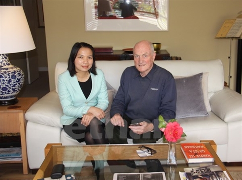 | La correspondante de la VNA à Sydney et l'ancien ambassadeur australien au Vietnam, Richard Broinowski à son domicile. |