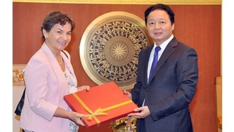 Le ministre de l’Environnement et des Ressources naturelles, Trân Hông Hà, a hautement apprécié les efforts de Christiana Figueres dans la conduite du processus de négociation entre 196 pays et territoires, organisations internationales, institutions financières et les ONG pour signer l'accord historique de Paris sur les changements climatiques en 2015.