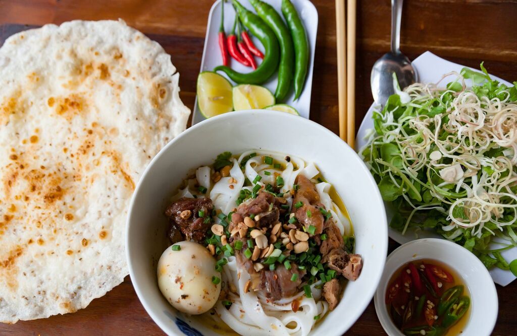 Plat typique du Centre : nouilles épaisses, viande, crevettes, cacahuètes et juste une touche de bouillon parfumé.