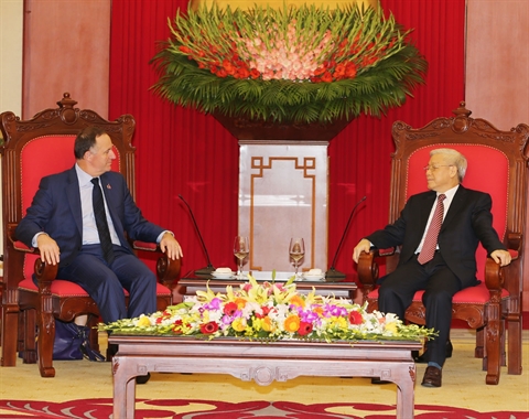 | Le secrétaire général du Parti communiste du Vietnam, Nguyên Phu Trong (droite), reçoit le Premier ministre néo-zélandais, John Key. |
