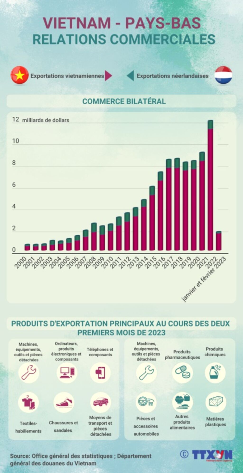 Plus récemment, lors de la visite officielle au Royaume des Pays-Bas du Premier ministre Pham Minh Chinh en décembre 2022, les dirigeants des deux pays ont convenu d'intensifier et d'approfondir la coopération entre les deux pays dans le cadre de la stratégie de partenariat sur l'adaptation au changement climatique et le Partenariat stratégique sur l'agriculture durable, de l'élargir dans les domaines de la sécurité, la défense, de la culture et du tourisme, des transports, des sciences et technologies, de l'éducation et de la formation, et de continuer à se soutenir mutuellement lors de forums multilatéraux tels que le cadre de coopération ASEAN - UE, le sommet Asie - Europe (ASEM), l'ONU....