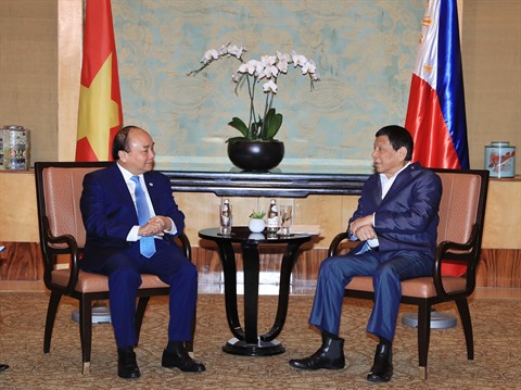 | Le Premier ministre Nguyên Xuân Phuc (gauche) et le président philippin Rodrigo Duterte, le 27 avril à Singapour. |