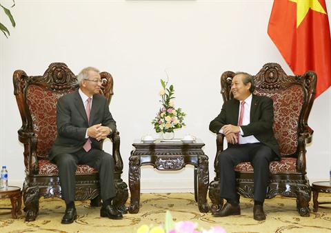 | Le président de la Cour populaire suprême Nguyên Hoà Binh (droite) et le président de la Cour suprême sud-coréenne Yang Sung-tae, le 28 août à Hanoï. |