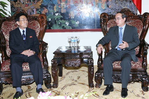 | Le vice-Premier ministre Nguyên Thiên Nhân (droite) et le Professeur Song Ja Rip, membre du Comité central du Parti du Travail de RPDC, le 2 août à Hanoi. |