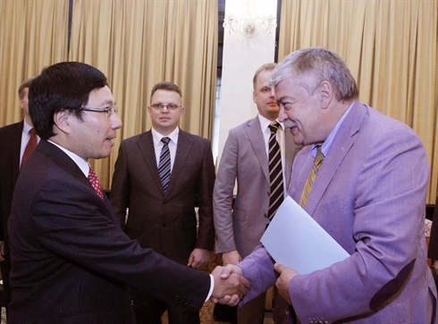 | Le vice-Premier ministre et ministre des Affaires étrangères, Pham Binh Minh (gauche), serre la main au secrétaire général du Conseil de sécurité de la Fédération de Russie, Evgeniy Vladimirovich, le 9 octobre à Hanoi. |
