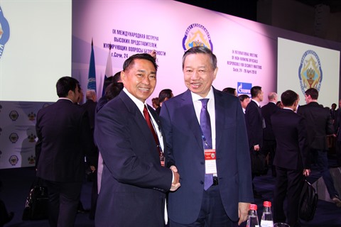 | Le ministre vietnamien de la Police, Tô Lâm (droite), et un représentant des Philippines, le 25 avril en Russie. |