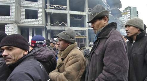 | Des travailleurs immigrés sur un chantier suspendu dans l'Oural, à 1.500 km de Moscou. |
