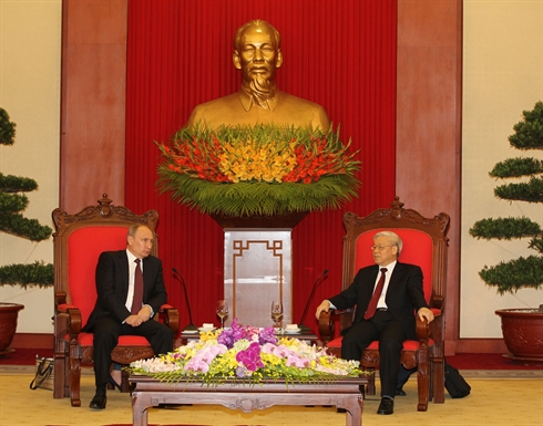 | Le secrétaire général du PCV, Nguyên Phú Trong (droite), et le président russe Vladimir Poutine, le 12 novembre à Hanoi.  |