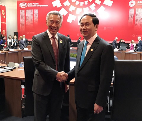 | Trân Dai Quang (droite) et Lee Hsien Loong, le 19 novembre lors du 24e Sommet de l'APEC à Lima, au Péru. |