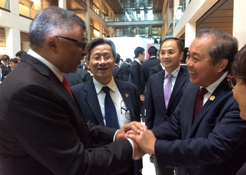 | Le président de la Cour populaire suprême du Vietnam, Truong Hoà Binh (droite), lors d'une visite de travail à Singapour du 4 au 6 janvier. |