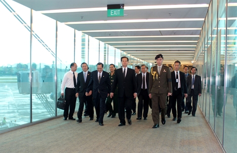 | Le Premier ministre vietnamien Nguyên Tân Dung (centre) est arrivé le 29 mars à Singapour pour participer aux funérailles nationales de l'ex-Premier ministre singapourien Lee Kuan Yew. |