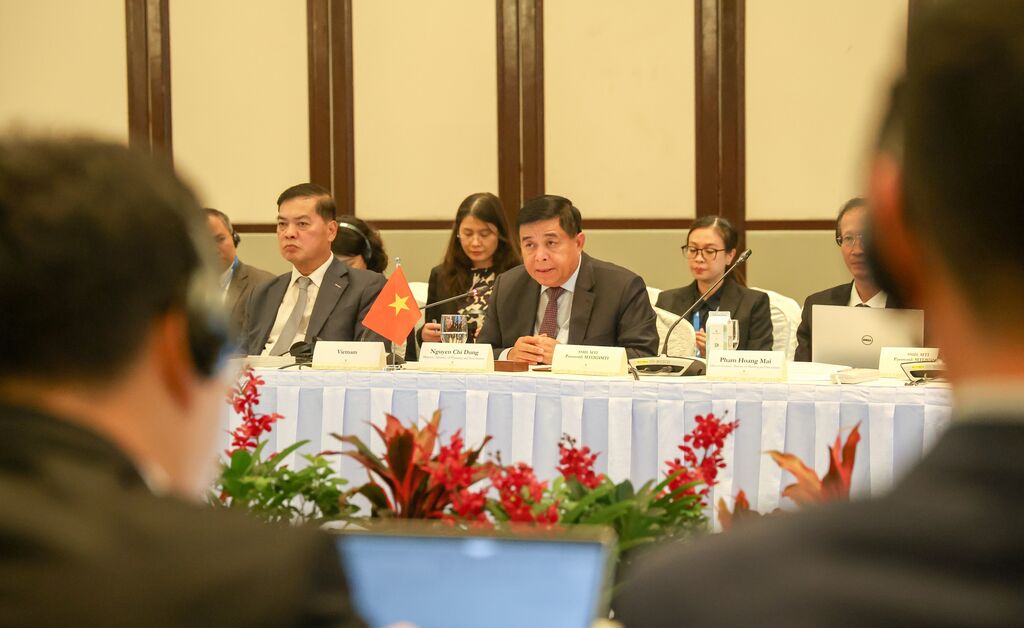 | Le ministre du Plan et de l'Investissement, Nguyên Chi Dung (centre), s'exprimant la 18e Conférence ministérielle sur la connectivité économique Singapour - Vietnam. |