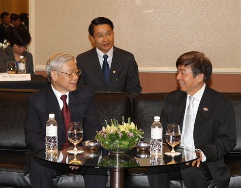 | Le secrétaire général Nguyên Phu Trong (gauche) et le chef du Parti d'action populaire de Singapour, Khaw Bun Wan, le 13 septembre. |