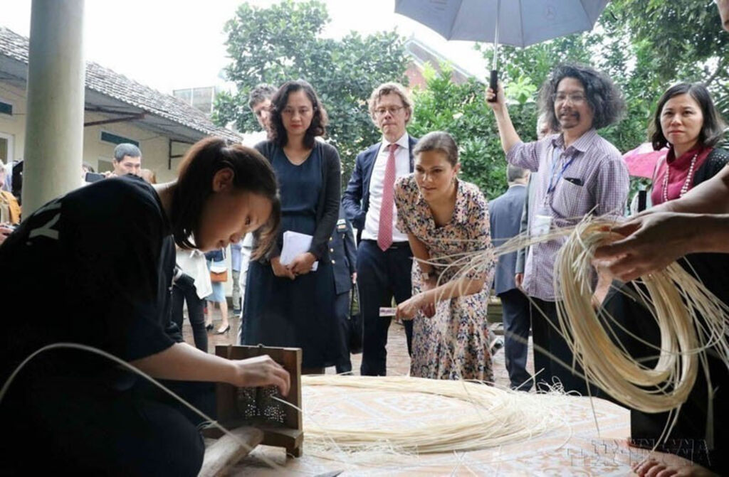 | La princesse héritière de Suède Victoria Ingrid Alice Désirée visite le village traditionnel de vannerie du village de Phu Vinh, commune de Phu Nghia, district de Chuong My, à Hanoï, lors de sa visite officielle au Vietnam (7 mai 2019). |
