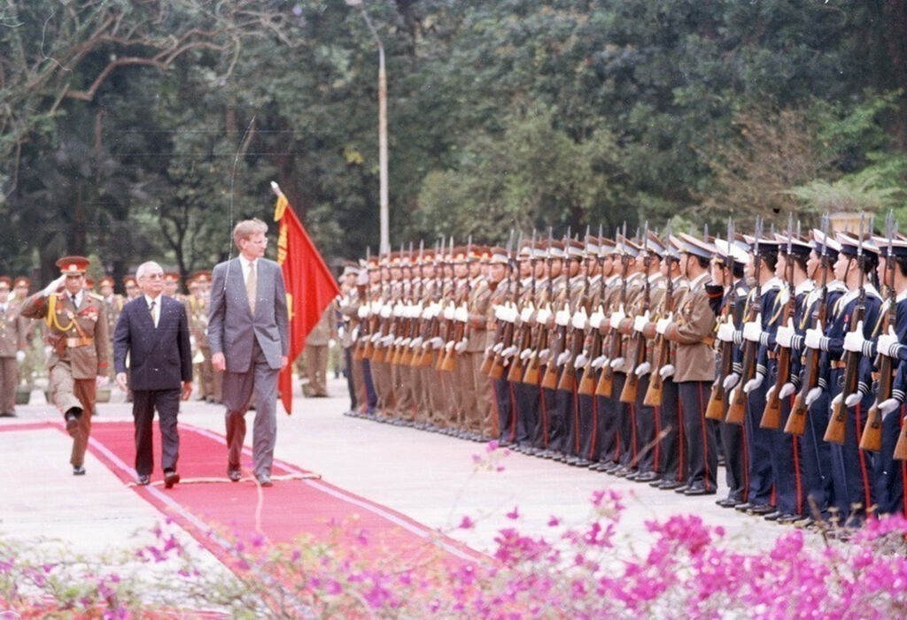 | Le Premier ministre Vo Van Kiêt (gauche) préside la cérémonie d'accueil du Premier ministre suédois Carl Bildt, en visite officielle au Vietnam, le matin du 7 avril 1994. |