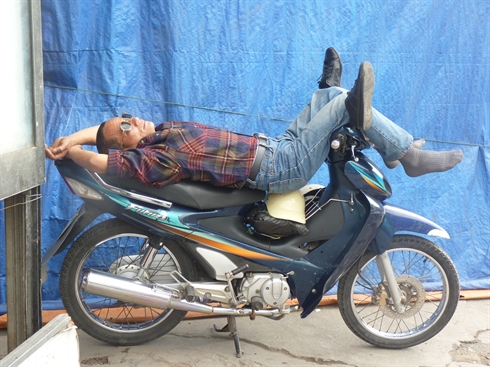 | Dormir dehors ou en public, une habitude pour de nombreux Vietnamiens, en particulier les xe ôm (motos-taxis). |