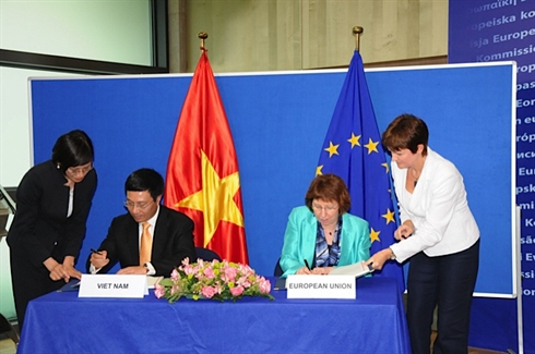 | Signature du PCA par Pham Binh Minh, ministre vietnamien des AE, et Catherine Ashton, vice-présidente de la CE, le 27 juin au siège de l' UE à Bruxelles. |