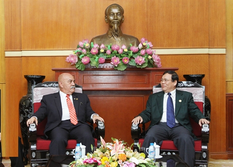 | Le vice-président et secrétaire général du Comité central du Front de la Patrie du Vietnam, Vu Trong Kim (droite) et le membre du Bureau politique et vice-président du Parti socialiste unifié du Venezuela, Dario Vivas, le 31 mars à Hanoi |