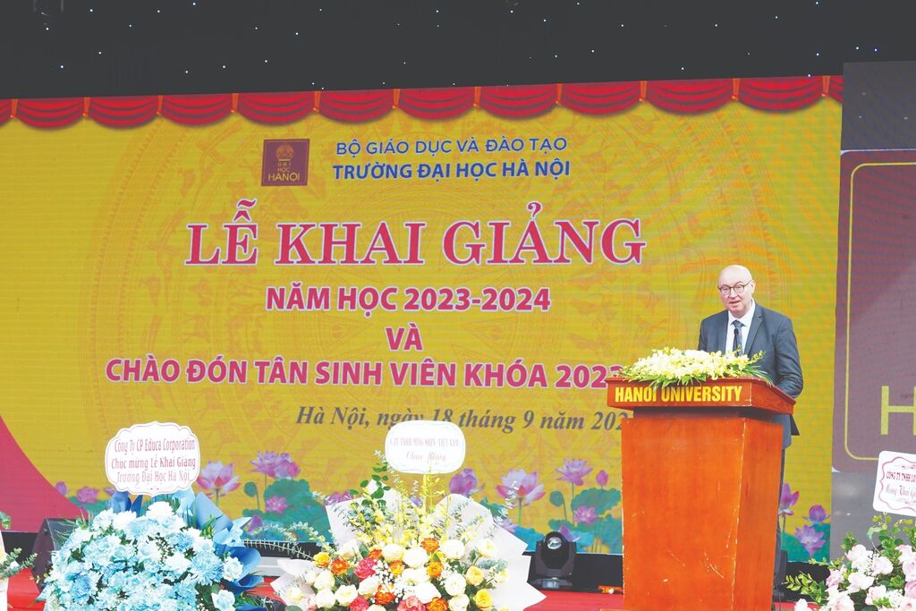 | Pierre Du Ville, Délégué général de Wallonie-Bruxelles au Vietnam, prend la parole lors de la rentrée 2023-2024 à l’Université de Hanoï. |