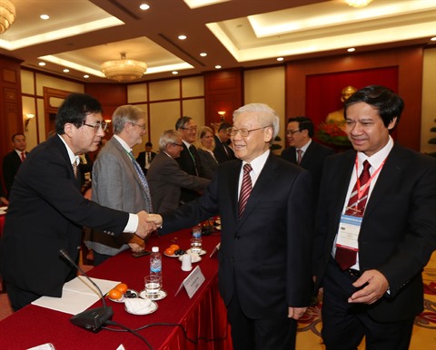 | Le secrétaire général du PCV Nguyên Phu Trong rencontre des participants étrangers au 5e symposium international sur la vietnamologie, en décembre dernier à Hanoi. |