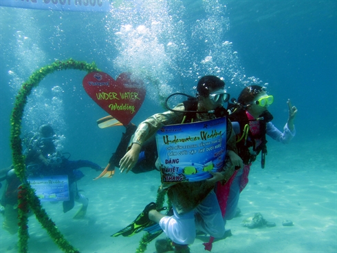 | La filiale de Vietravel à Nha Trang a récemment organisé un mariage collectif sous-marin pour dix couples dans cette ville. Photo : Anh Tuân/VNA/CVN |