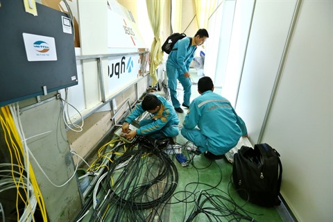| Des ingénieurs techniques de Viettel installent les équipements de télécommunciations au Centre de presse international. |