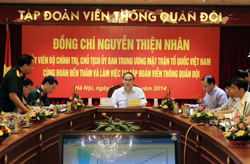 | Le président du Comité central du Front de la Patrie du Vietnam, Nguyên Thiên Nhân (centre), travaille avec le Groupe des télécommunications de l'Armée, le 7 juillet à Hanoi. Photo : Nguyên Dân/VNA/CVN |