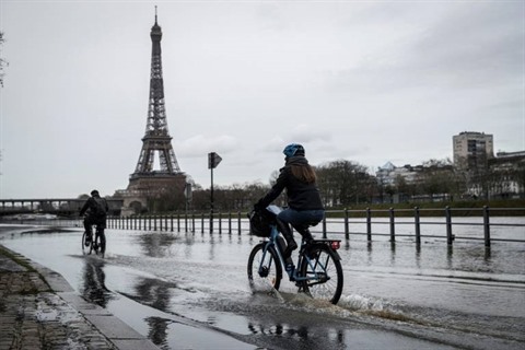 | Des cyclistes sur les berges inondées de la Seine, le 9 mars à Paris. |