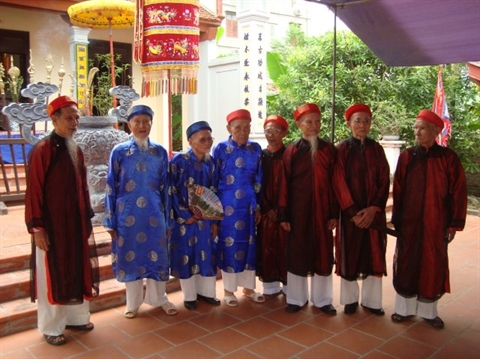 | Des anciens, descendants de Pham Vu, dans la maison de culte de la lignée, à Dôn Thu. |