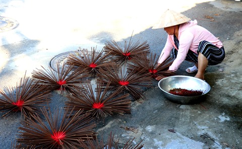 La confection de bâtons d'encens nécessite non seulement de nombreux ingrédients et passe par des étapes extrêmement soigneuses dont la plus importante étant le traitement de la poudre de bois d'agar et du "se huong" lorsque les artisans ajoute la poudre, mélangée au préalable, autour du noyau de l'encens.