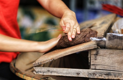 La confection de bâtons d'encens nécessite non seulement de nombreux ingrédients mais passe aussi par des étapes extrêmement soigneuses, dont la plus importante est le traitement de la poudre de bois d'agar et du "se huong" lorsque les artisans ajoutent la poudre, mélangée au préalable, autour du noyau de l'encens.