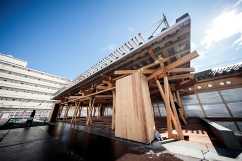 À l'instar d'édifices japonais historiques, ses sols, cloisons et piliers sont composés de poutres en bois (cèdre, mélèze, cyprès), symboliquement mis à disposition par une soixantaine de municipalités de tout le pays.
