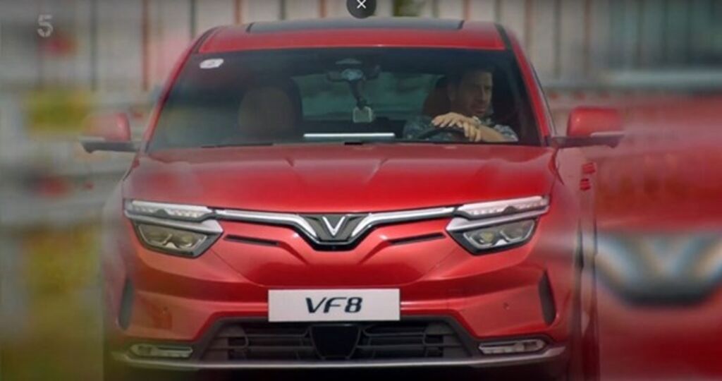 | Le présentateur de télévision Nick Knowles conduit une voiture VinFast VF 8. |