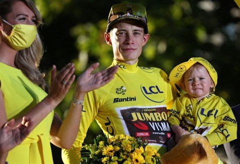 | Le Danois Jonas Vingegaard en famille à l'arrivée du Tour de France qu'il a remporté, le 24 juillet 2022 sur les Champs-Élysées. |
