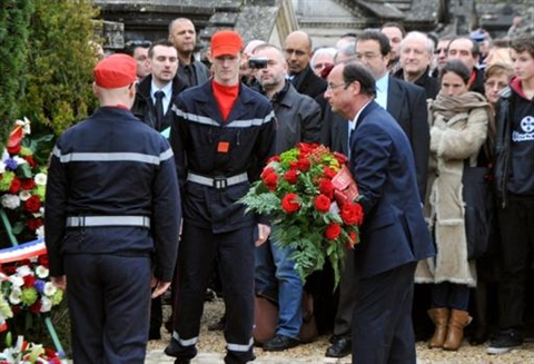 | François Hollande dépose une gerbe de fleurs sur la tombe de François Mitterrand à Jarnac. |