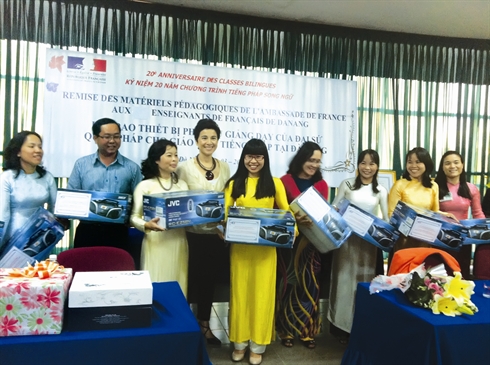 | Thanh-Huong (Eva) Nguyên Binh (4e, à gauche) à la cérémonie de remise des matériels pédagogiques de l’ambassade de France aux enseignants de français de Dà Nang. |