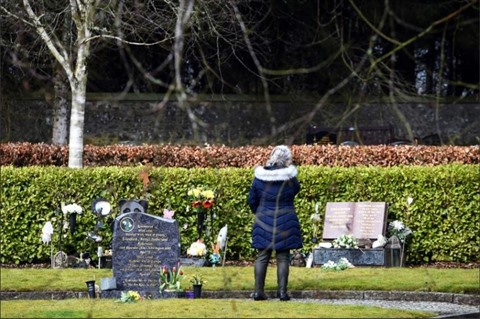 | Une femme se tient devant la tombe de Gwen Mayor, une enseignante tuée lors d'une fusillade à Dunblane (Royaume-Uni) en 1996, le 12 mars 2021. |
