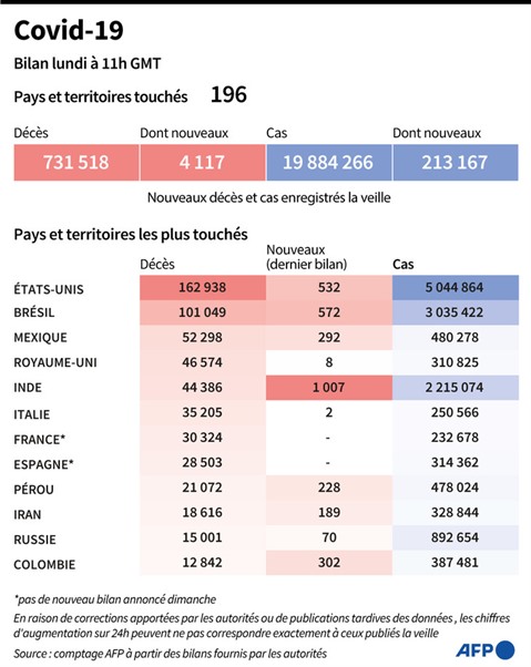 Plus de 20 millions de cas ont été officiellement recensés dans le monde, dont plus de la moitié en Amérique, selon un comptage réalisé par l'AFP à partir de sources officielles lundi 10 août à 22h15h GMT.